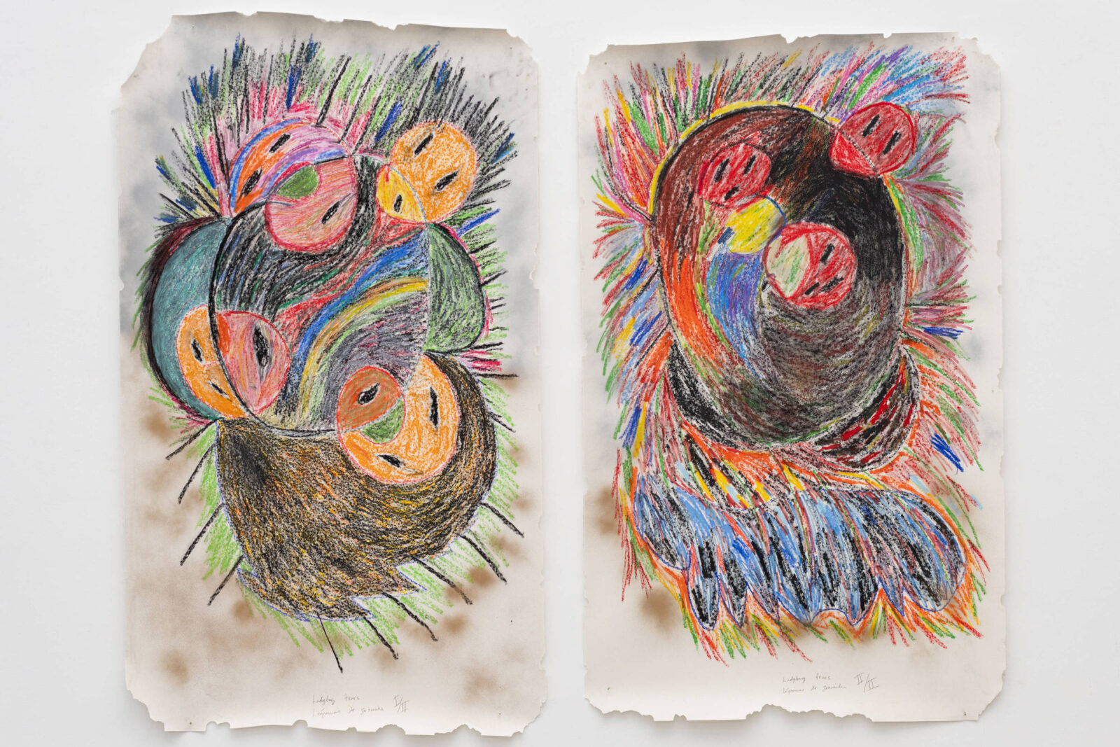 Na parede ao lado, estão pendurados desenhos de sua amiga, a artista trans Tadáskía. Conhecida pelo seu estilo lúdico e criativo, ela traz, a esta mostra, obras inéditas com tons mais sombrios e traços errantes. “Meu interesse é pela transformação”, diz. “Nunca me vi tão aproximada de uma certa iluminação obscura”.