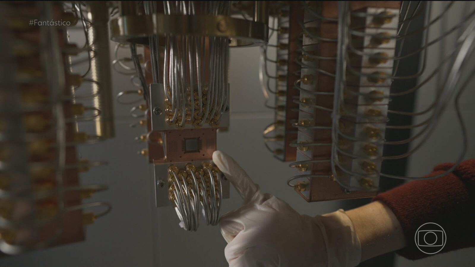 A evolução disso, o Fantástico foi conhecer na sede da IBM, em Nova York. Lá está a tecnologia mais complexa que o ser humano já viu: são cabos super finos e placas de ouro que servem para compartimentar os espaços. O computador quântico é um quadradinho, que fica em uma grande geladeira, e onde está um universo microscópico capaz de mudar o mundo.
