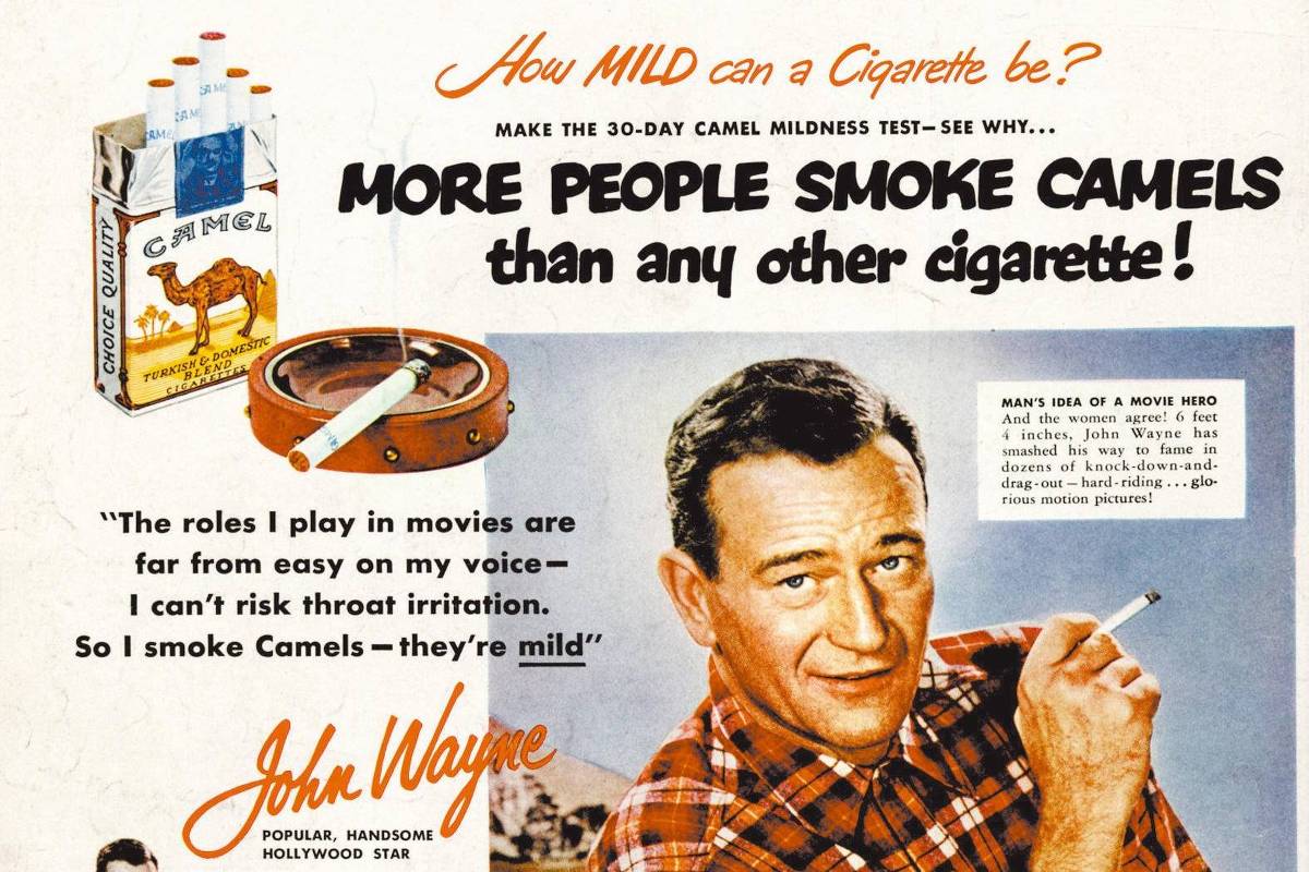 Wayne escolheu Camel porque não irritava sua garganta. Mas todos os outros cigarros prometiam isso, e também nas palavras de astros do cinema: Fred Astaire, Bob Hope e Ronald Reagan diziam o mesmo do Chesterfield. Gary Cooper, Marlene Dietrich e Al Jolson, do Lucky Strike; e Lucille Ball, no apogeu de “I Love Lucy”, jurava pelo Philip Morris. Conclui-se que, até para os fabricantes, o cigarro irritava a garganta, exceto o deles.