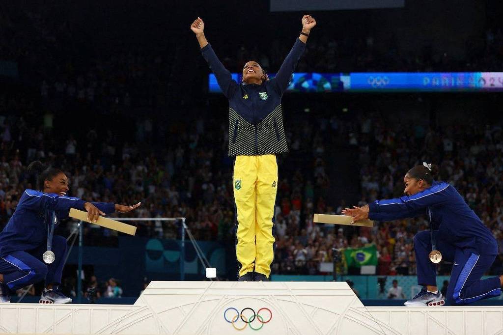 Um de seus momentos favoritos das Olimpíadas de Paris é o pódio da competição por equipes, o primeiro bronze do Brasil nessa categoria e um momento de celebração que ela pode compartilhar com as colegas.