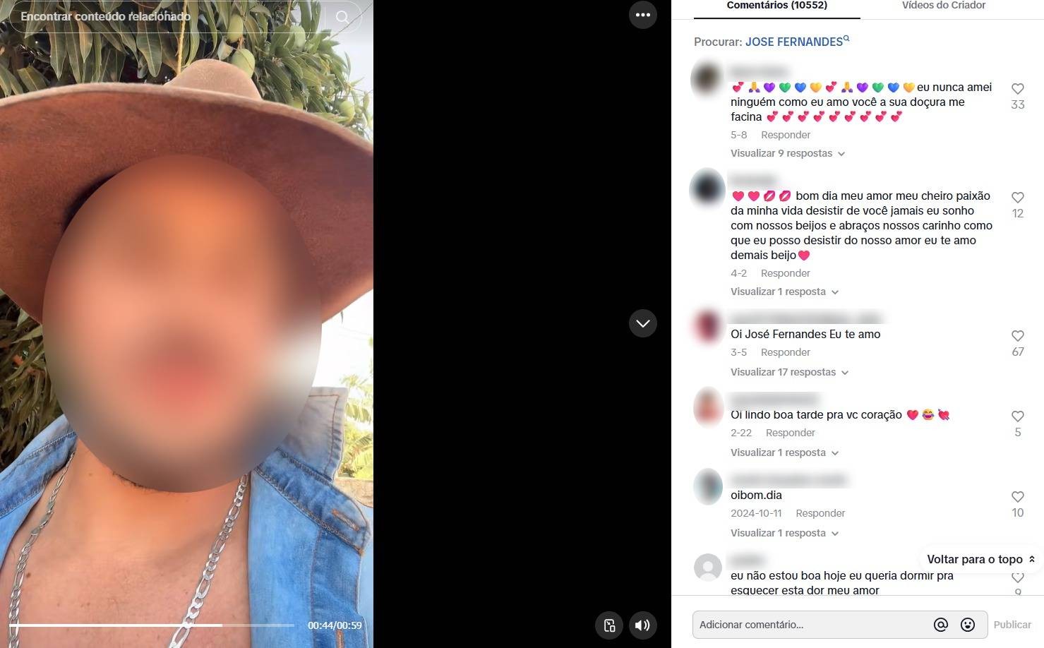 No caso de José Fernandes, ele disse que chegou a registrar um boletim de ocorrência porque recebeu a informação de que criminosos usaram sua imagem para enganar uma seguidora. Nos comentários, algumas relatam prejuízos de até R$ 9 mil depois de receberem ligações com pessoas que usavam a imagem do perfil no TikTok.
